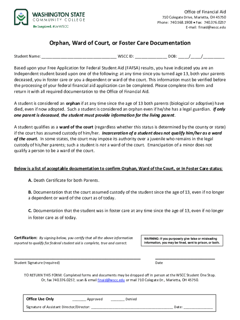 Office of Financial Aid 710 Colgate Drive, Marietta, OH 45750 Phone: 740.568.1908 Fax: 740.376.0257 Email: finaid@wscc.eduOrphan, Ward of Court, or Foster Care Documentation Student Name: ___ SCC