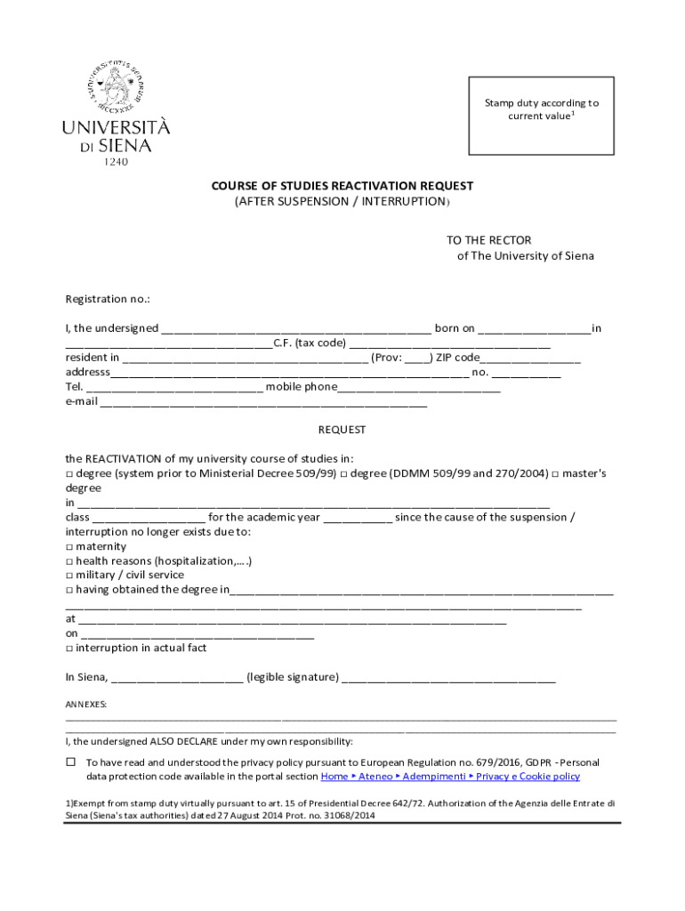Stamp duty according to current value1COURSE OF STUDIES REACTIVATION REQUEST (AFTER SUSPENSION / INTERRUPTION) TO THE RECTOR of The University of SienaRegistration no.: I, the undersigned ___ born