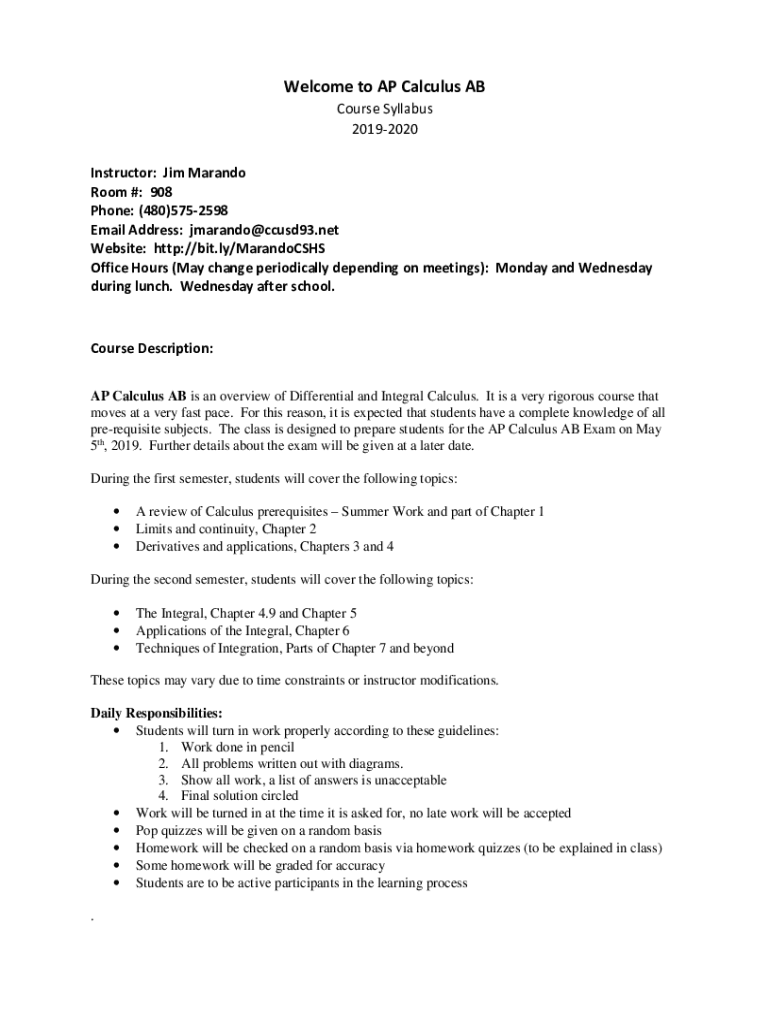 Get the free AP Calculus AB Syllabus Mr. Marando Room 908 (480) 575 ...