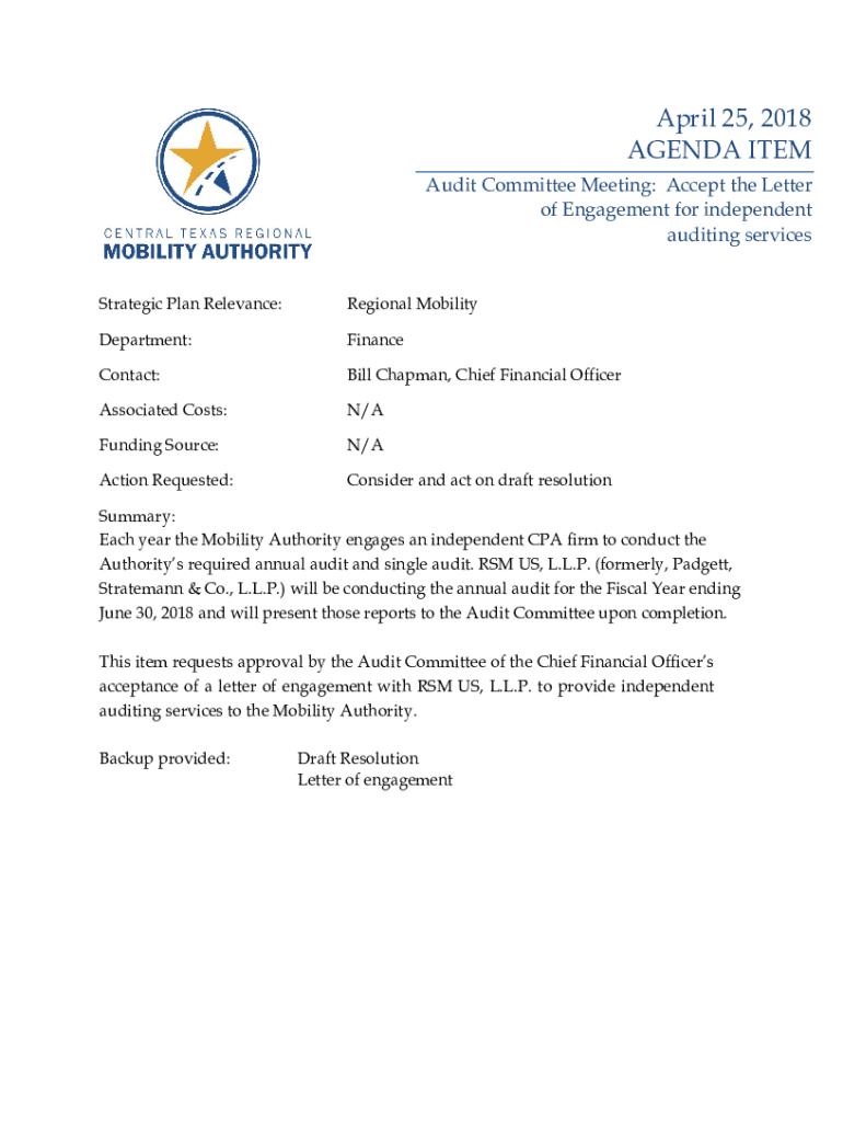 April 25, 2018, AGENDA ITEM Audit Committee Meeting: Accept the Letter of Engagement for independent auditing services Strategic Plan Relevance:Regional MobilityDepartment:FinanceContact:Bill Chapman,