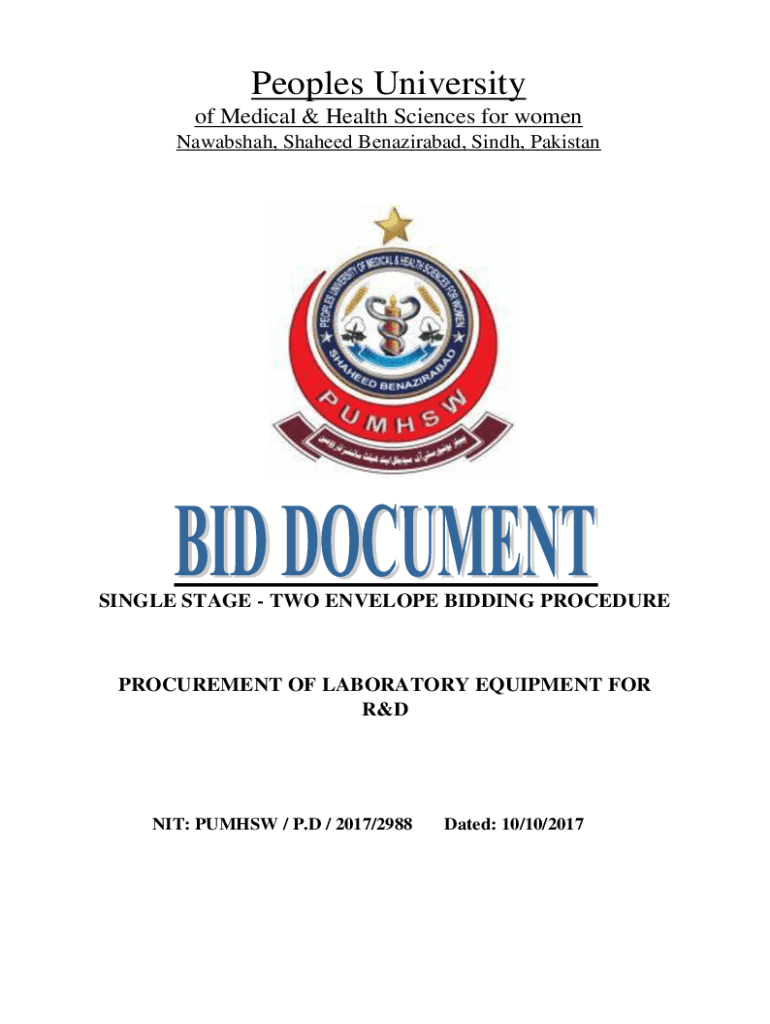 Nawabshah, Shaheed Benazirabad, Sindh, PakistanSINGLE STAGE TWO ENVELOPE BIDDING PROCEDUREPROCUREMENT OF LABORATORY EQUIPMENT FOR