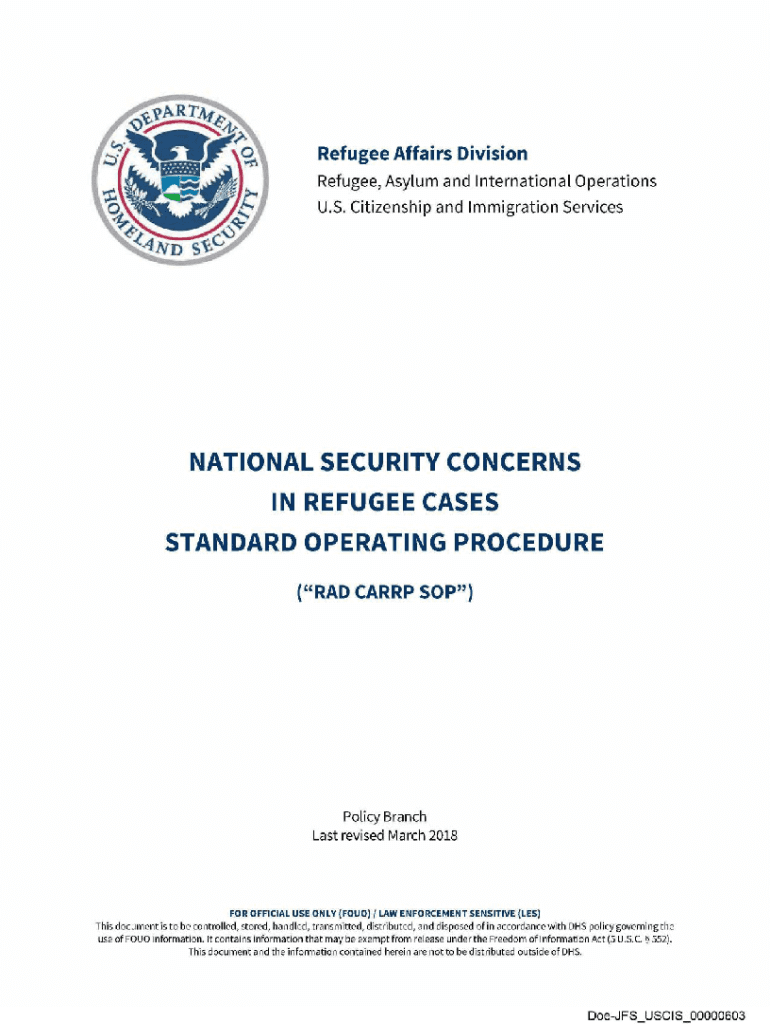 Refugee Affairs Division Refugee, Asylum and International Operations U.S. Citizenship and Immigration ServicesNATIONAL SECURITY CONCERNS IN REFUGEE CASES STANDARD OPERATING PROCEDURE (\” RAD CARRY