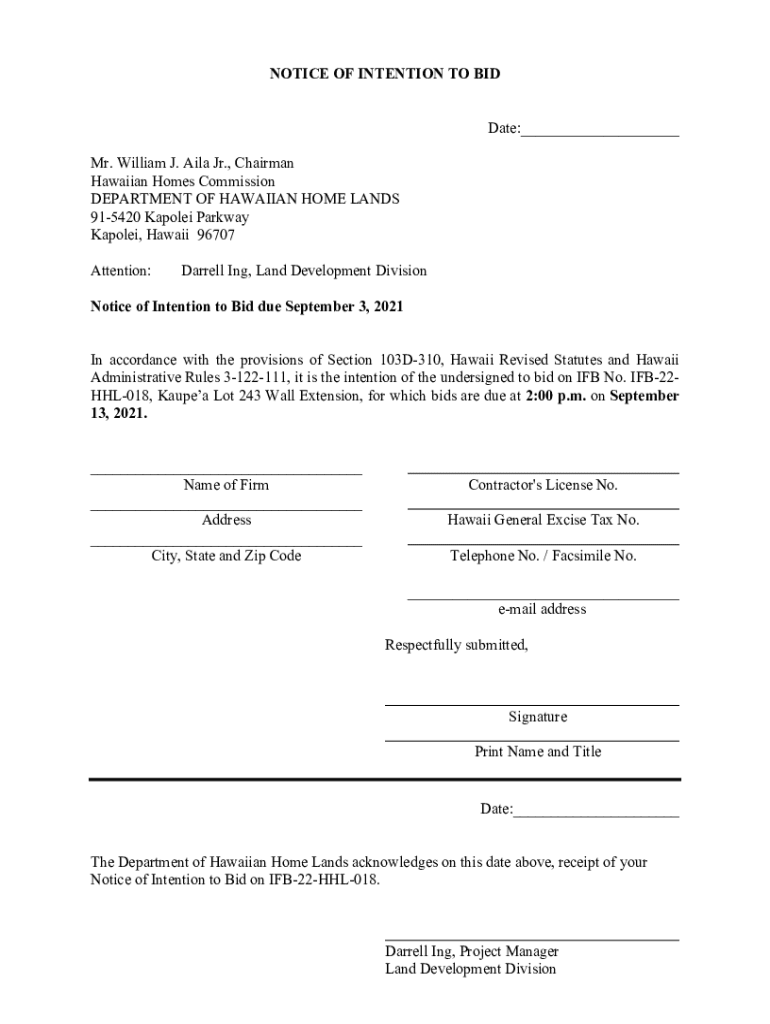 NOTICE OF INTENTION TO BID Date:___ Mr. William J. Vila Jr., Chairman Hawaiian Homes Commission DEPARTMENT OF HAWAIIAN Homelands 915420 Cupola Parkway Cupola, Hawaii 96707 Attention:Darrell ING, Land