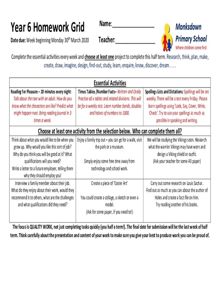 Year 6 Homework Graduate:___Date due: Week beginning Monday 30th March 2020Teacher:___Complete the essential activities every week and choose at least one project to complete this half-term. Research,
