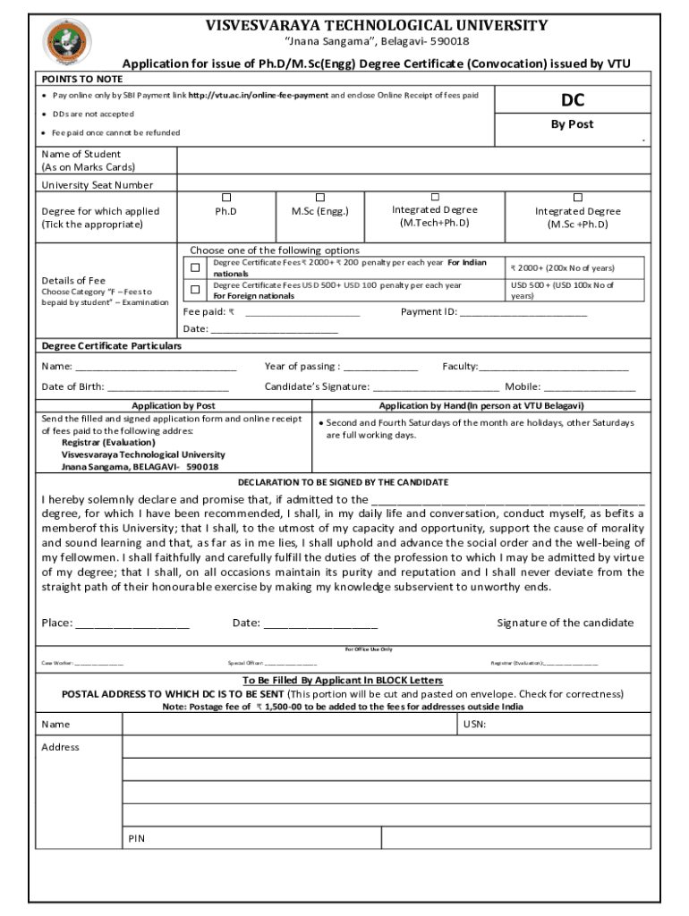 VISVESVARAYA TECHNOLOGICAL UNIVERSITY Jana Panama, Bengali 590018Application for issue of Ph.D./M.Sc.(Egg) Degree Certificate (Convocation) issued by ITU POINTS TO NOTE Pay online only by SBI Payment