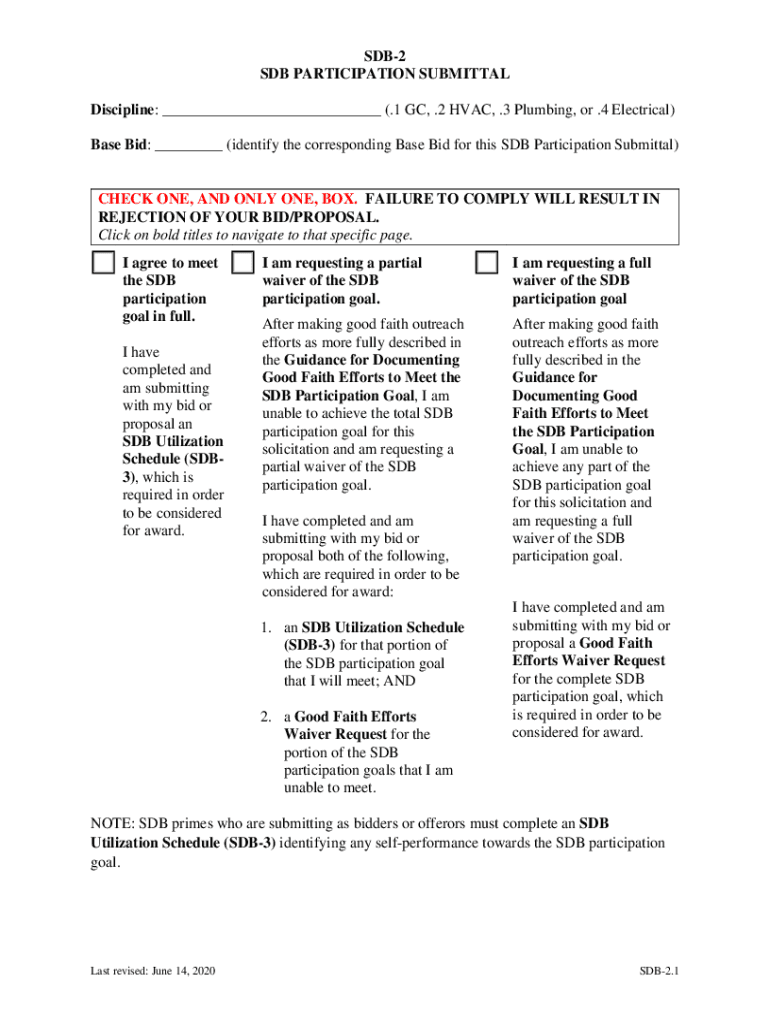 SDB1 INSTRUCTIONS FOR COMPLETING THE SMALL DIVERSE BUSINESS (SUB) PARTICIPATION SUBMITTAL AND SUB UTILIZATION SCHEDULE.PLEASE READ BEFORE COMPLETING THESE DOCUMENTS Bidders/Offers do not need to return