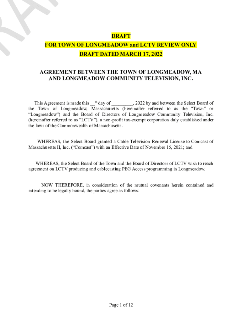 DRAFT DATED MARCH 17, 2022AGREEMENT BETWEEN THE TOWN OF LONGFELLOW, MA