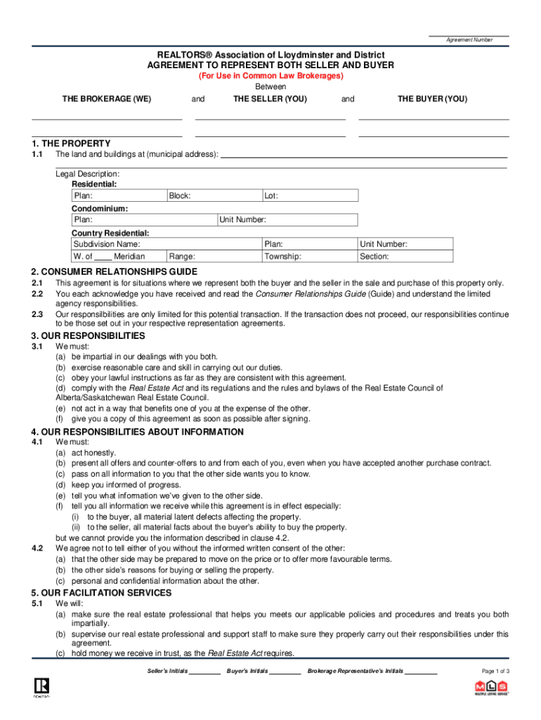 Agreement NumberREALTORS Association of Lloyd minster and District AGREEMENT TO REPRESENT BOTH SELLER AND BUYER (For Use in Common Law Brokerages) Between and THE SELLER (YOU) another BROKERAGE (WE)THE