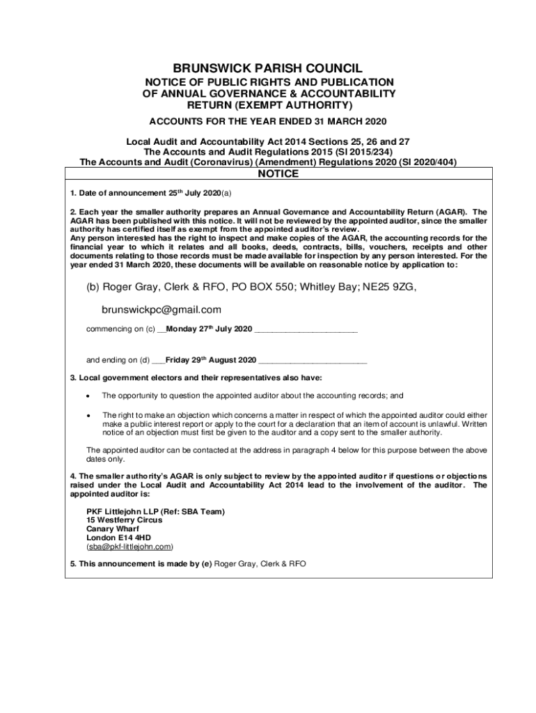 BRUNSWICK PARISH COUNCIL NOTICE OF PUBLIC RIGHTS AND PUBLICATION OF ANNUAL GOVERNANCE & ACCOUNTABILITY RETURN (EXEMPT AUTHORITY) ACCOUNTS FOR THE YEAR ENDED 31 MARCH 2020 Local Audit and Accountability