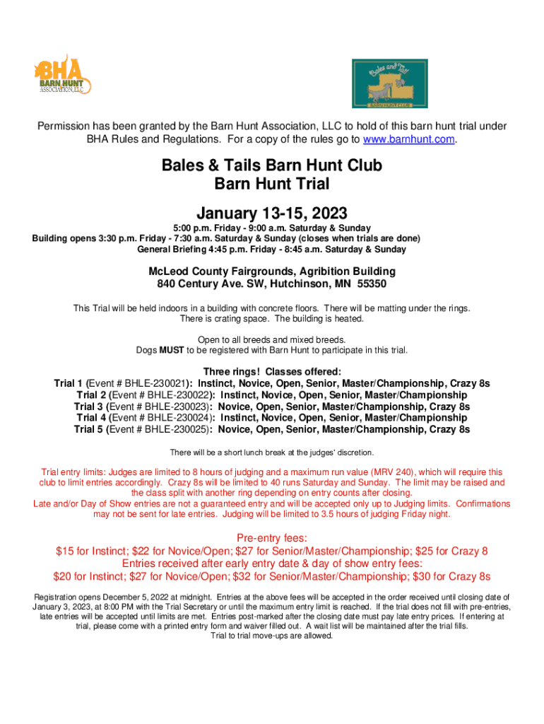 Permission has been granted by the Barn Hunt Association, LLC to hold of this barn hunt trial under BHA Rules and Regulations. For a copy of the rules go to www.barnhunt.com. Bales & Tails Barn Hunt