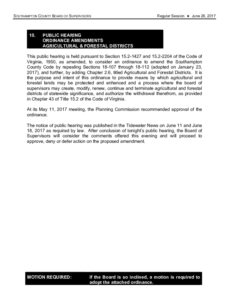 SOUTHAMPTON COUNTY BOARD OF SUPERVISORS10. Regular Session i June 26, 2017PUBLIC HEARING ORDINANCE AMENDMENTS AGRICULTURAL & FORESTALL DISTRICTSThis public hearing is held pursuant to Section 15.21427