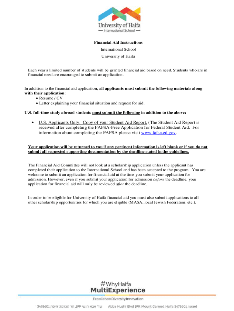 Financial Aid Instructions International School University of Haifa Each year a limited number of students will be granted financial aid based on need. Students who are in financial need are encouraged