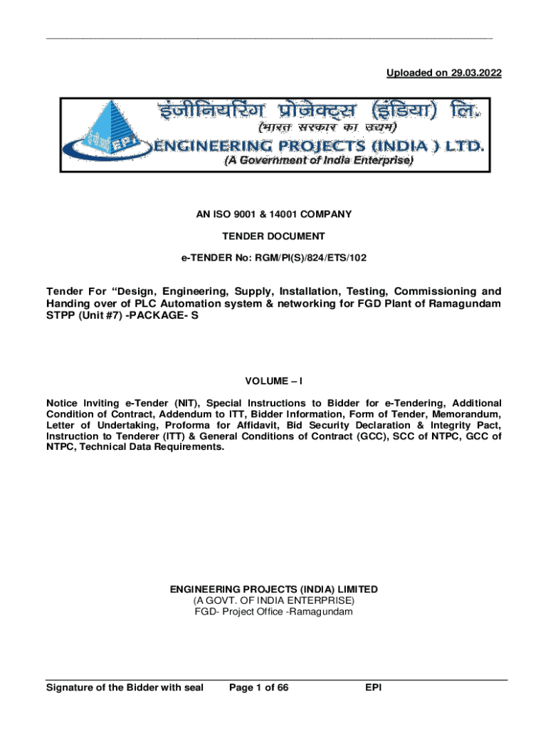 ___Uploaded on 29.03.2022AN ISO 9001 & 14001 COMPANY TENDER DOCUMENT tender No: RIM/PI(S)/824/ETS/102Tender For Design, Engineering, Supply, Installation, Testing, Commissioning and Handing over of