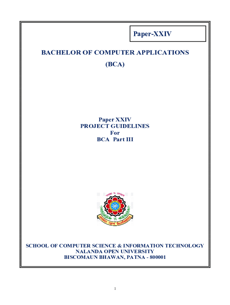 Paperclip BACHELOR OF COMPUTER APPLICATIONS (BCA)Paper XXIV PROJECT GUIDELINES For BCA Part SCHOOL OF COMPUTER SCIENCE & INFORMATION TECHNOLOGY AMANDA OPEN UNIVERSITY BISCOMAUN SHAWN, PATNA 8000011CONTENTSSl.