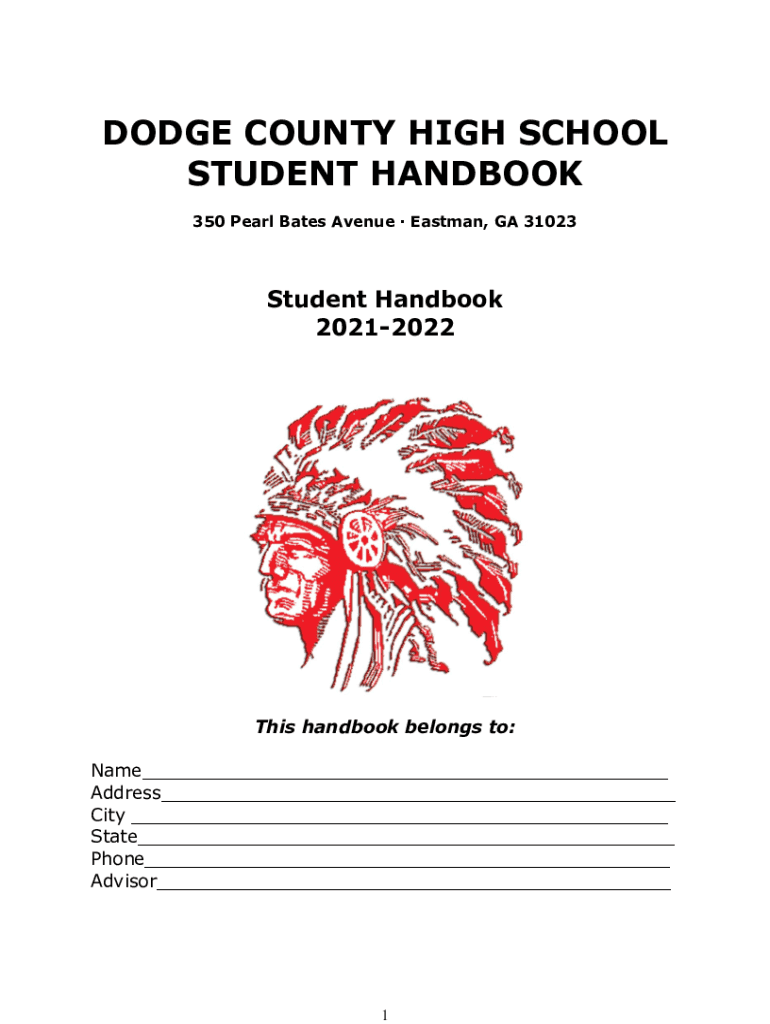 DODGE COUNTY HIGH SCHOOL STUDENT HANDBOOK 350 Pearl Bates Avenue Eastman, GA 31023Student Handbook 20212022This handbook belongs to: Name___ Address___ City ___ State___ Phone___ Advisor___1350 Pearl
