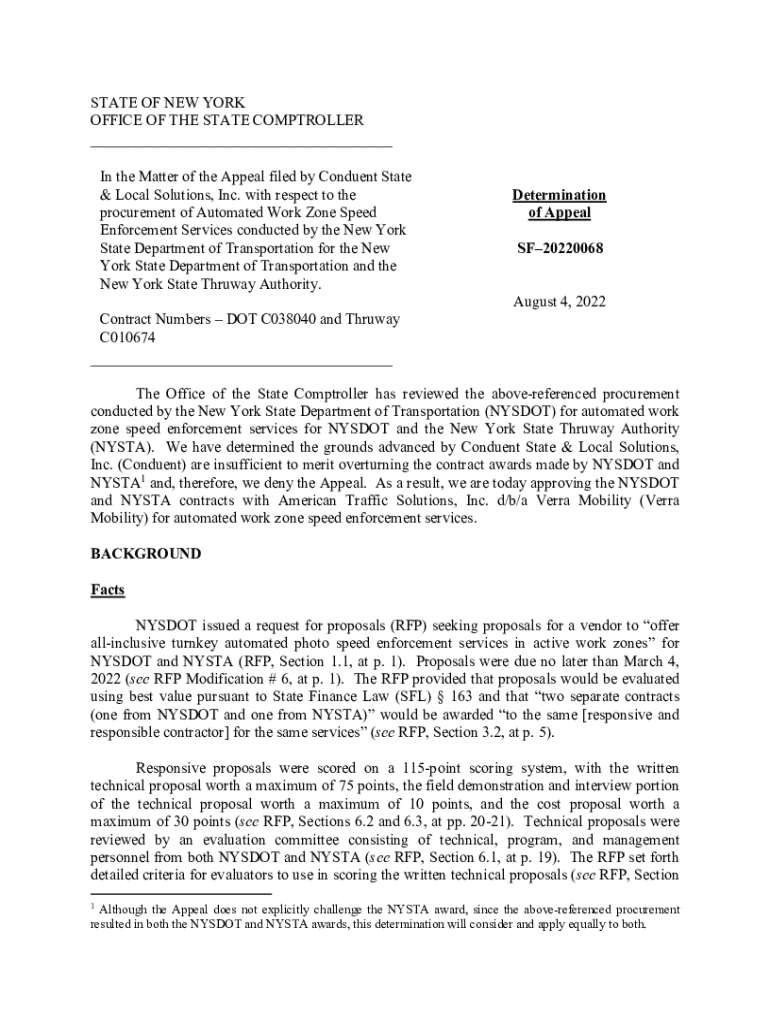 STATE OF NEW YORK OFFICE OF THE STATE COMPTROLLER ___ In the Matter of the Appeal filed by Conduct State & Local Solutions, Inc. with respect to the procurement of Automated Work Zone Speed Enforcement