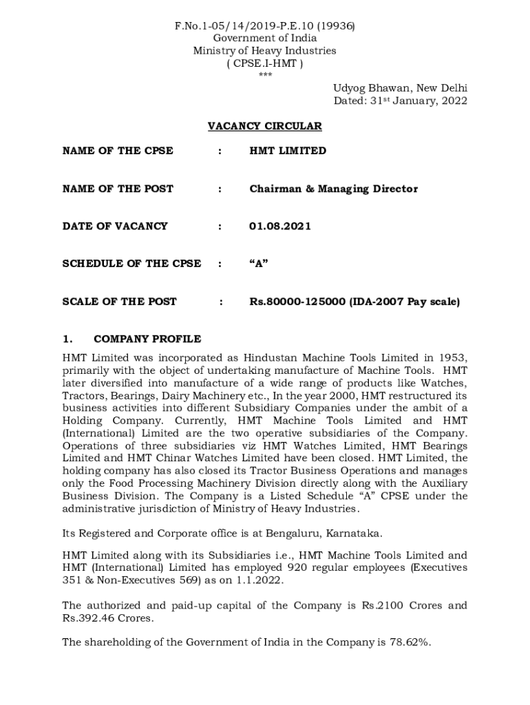 F. No.105/14/2019P. E.10 (19936) Government of India Ministry of Heavy Industries (CASE.IMT) *** Dog Shawn, New Delhi Dated: 31st January 2022 VACANCY CIRCULAR NAME OF THE CASE:HIT LIMITEDNAME OF