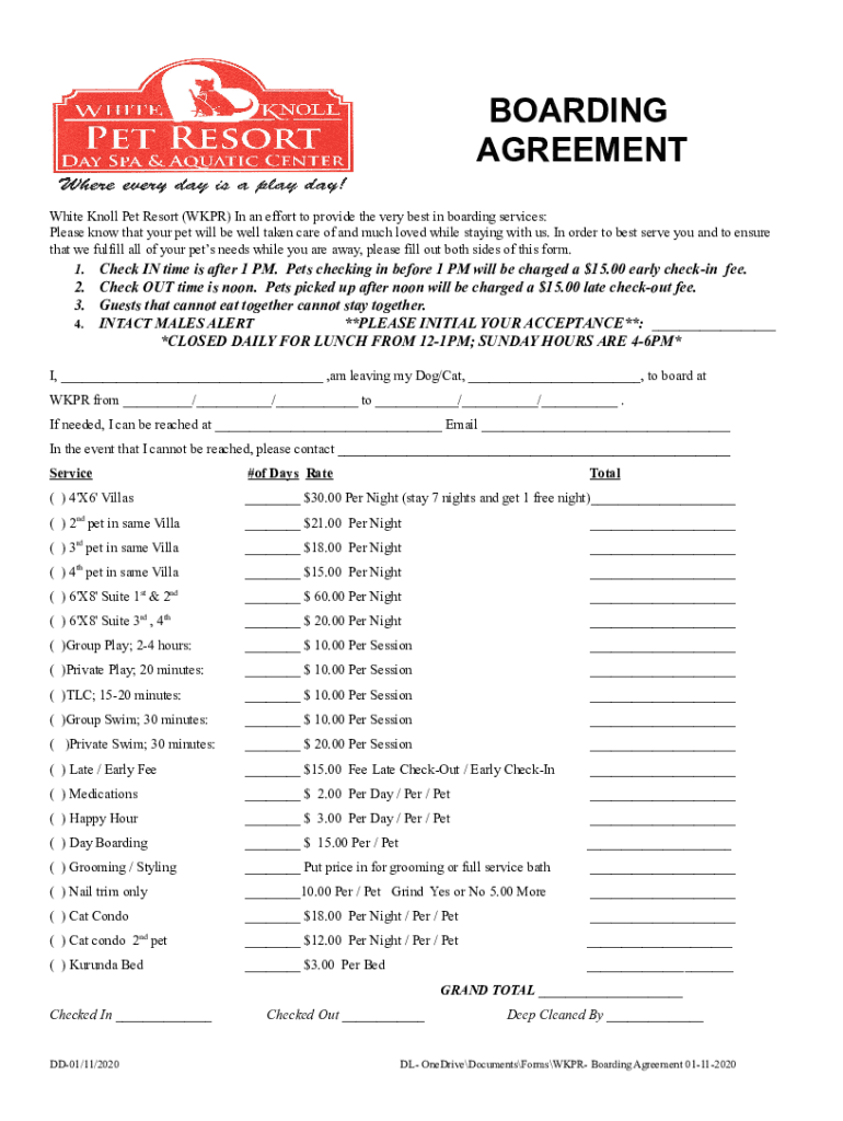 BOARDING AGREEMENT White Knoll Pet Resort (WK PR) In an effort to provide the very best in boarding services: Please know that your pet will be well taken care of and much loved while staying with