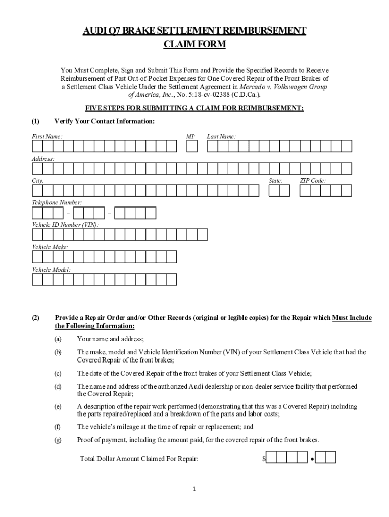 AUDI Q7 BRAKE SETTLEMENT REIMBURSEMENT CLAIM FORM You Must Complete, Sign and Submit This Form and Provide the Specified Records to Receive Reimbursement of Past OutofPocket Expenses for One Covered