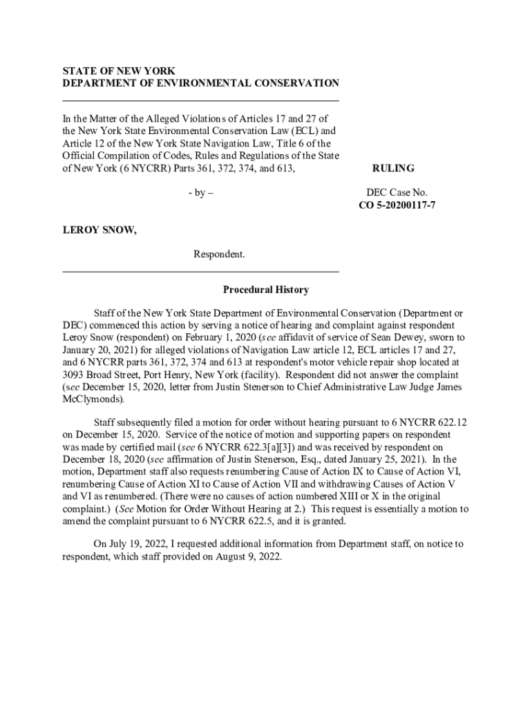 STATE OF NEW YORK DEPARTMENT OF ENVIRONMENTAL CONSERVATION ___ In the Matter of the Alleged Violations of Articles 17 and 27 of the New York State Environmental Conservation Law (ECL) and Article