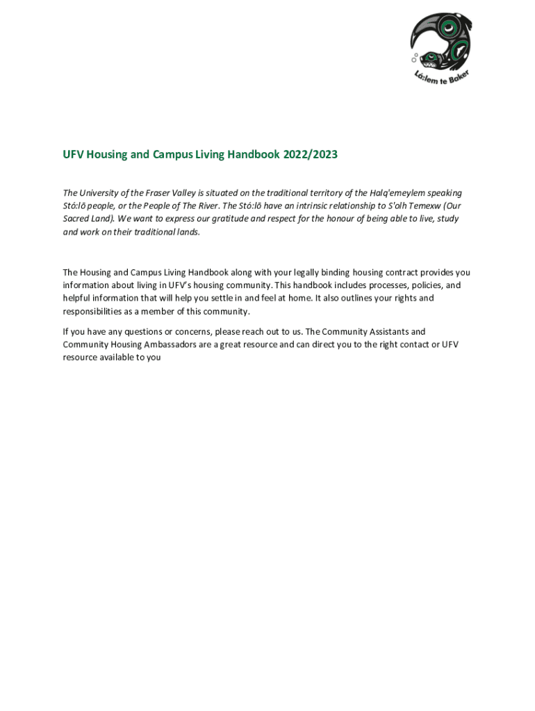 UV Housing and Campus Living Handbook 2022/2023 The University of the Fraser Valley is situated on the traditional territory of the Half\'emblem speaking St:l people, or the People of The River. The