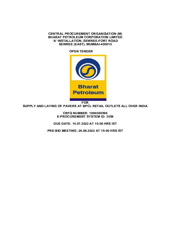 CENTRAL PROCUREMENT Organization (M) BHARAT PETROLEUM CORPORATION LIMITED A INSTALLATION, SEWREEFORT ROAD DEGREE (EAST), MUMBAI400015 OPEN TENDERER SUPPLY AND LAYING OF PAVERS AT BCL RETAIL OUTLETS