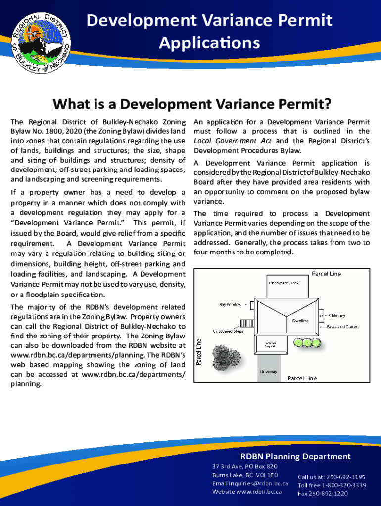 Development Variance Permit Applications What is a Development Variance Permit? The Regional District of BulkleyNechako Zoning Bylaw No. 1800, 2020 (the Zoning Bylaw) divides land into zones that