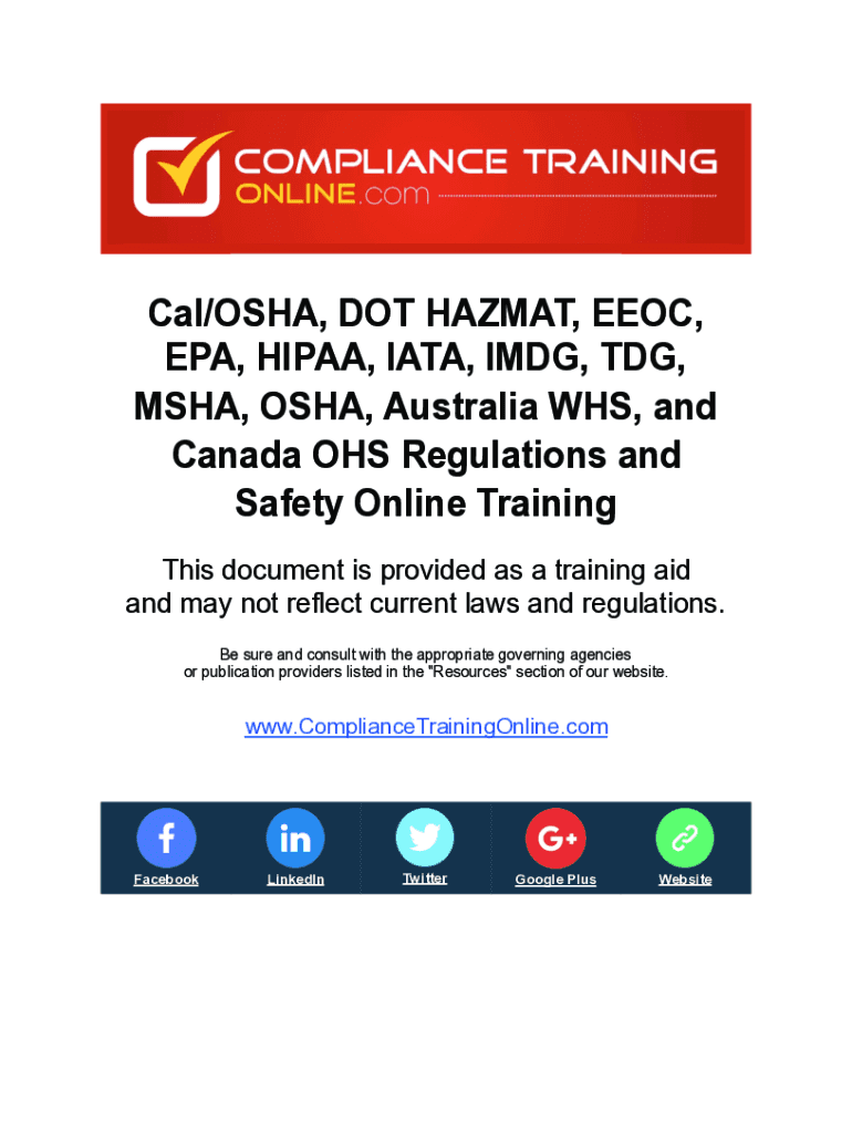 ! Cal/OSHA, DOT HAZMAT, EEOC, EPA, HIPAA, IATA, IMG, TDG, OSHA, OSHA, Australia WHS, and Canada OHS Regulations and Safety Online Training This document is provided as a training aid and may not reflect