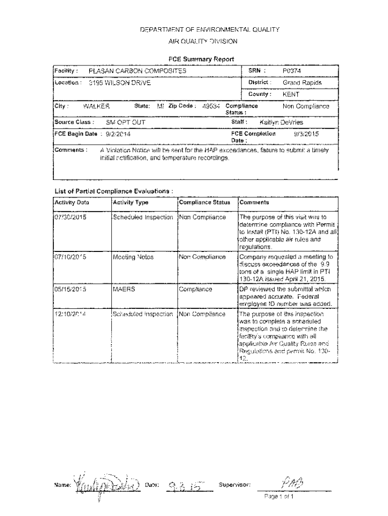 FCE Summary ReportLocationCityPLASAN CARBON COMPOSITES:P03743195 WILSON Redistrict:Grand RapidsCounty:Estate:Walker Zip Code:49534 Compliance.!!