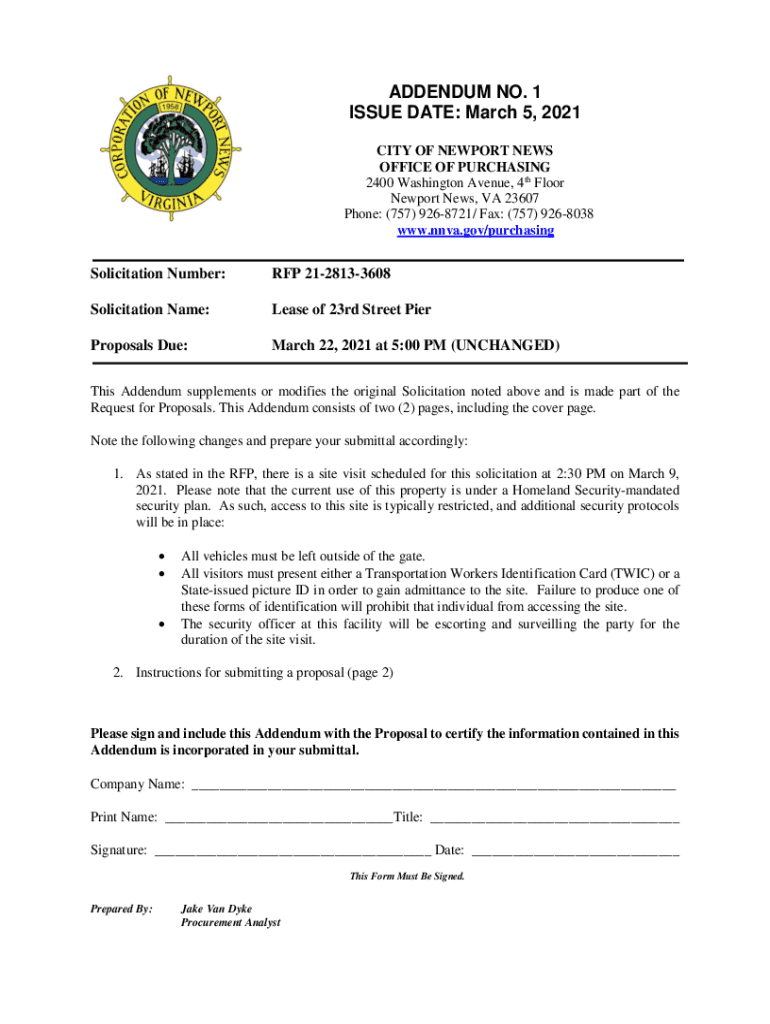 ADDENDUM NO. 1 ISSUE DATE: March 5, 2021, CITY OF NEWPORT NEWS OFFICE OF PURCHASING 2400 Washington Avenue, 4th Floor Newport News, VA 23607 Phone: (757) 9268721/ Fax: (757) 9268038 www.nnva.gov/purchasingSolicitation