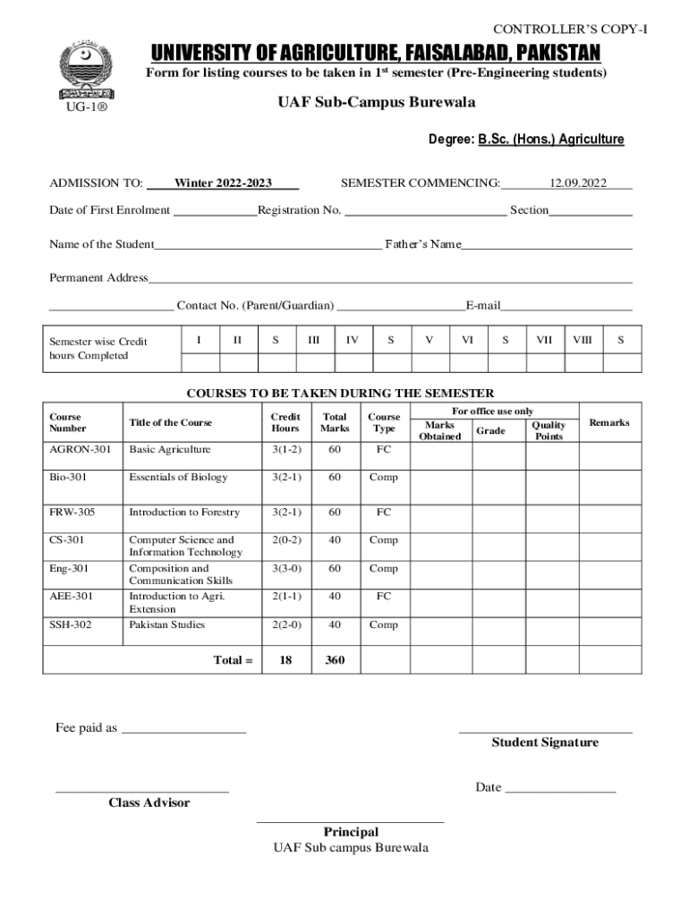 Form for listing courses to be taken in 1st semester (Reengineering students)UHF Campus BurewalaUG1Degree: B.Sc. (Hons.) Agriculture