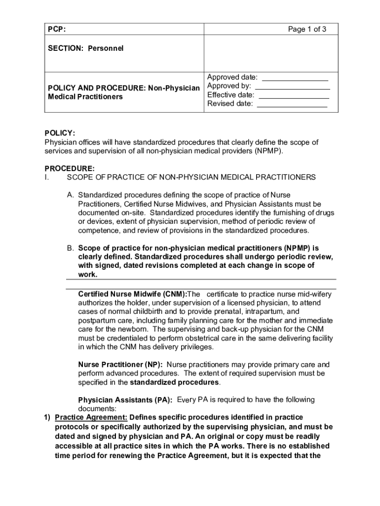PCP:Page 1 of 3SECTION: Personnel Approved date: ___ POLICY AND PROCEDURE: Nonphysical Approved by: ___ Effective date: ___ Medical Practitioners Revised date: ___POLICY: Physician offices will have