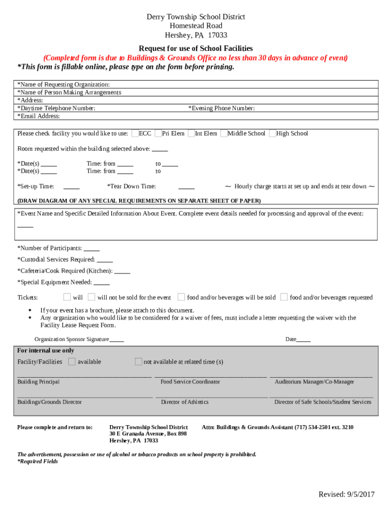 The Buildings & Grounds / Facilities Usage is a writable document which can be completed and signed for specific needs. In that case, it is furnished to the exact addressee in order to provide some information of certain kinds. The completion and signing is available manually or with an appropriate tool like PDFfiller. Such tools help to complete any PDF or Word file online. It also allows you to edit it for the needs you have and put a valid digital signature. Once finished, the user ought to send the Buildings & Grounds / Facilities Usage to the respective recipient or several recipients by email and also fax. PDFfiller has a feature and options that make your template printable. It includes a number of settings when printing out. It doesn't matter how you send a form - in hard copy or by email - it will always look neat and organized. To not to create a new writable document from the beginning over and over, make the original form into a template. Later, you will have a rewritable sample.
