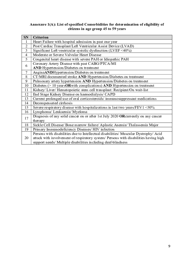Appendix 1(A): List of specified Comorbidities for determination of eligibility of citizens in age group 45 to 59 years SN 1 2 3 4 5 6 7 8 9 10 11 12 13 14 15 16 17 18 19 20Criterion Heart Failure