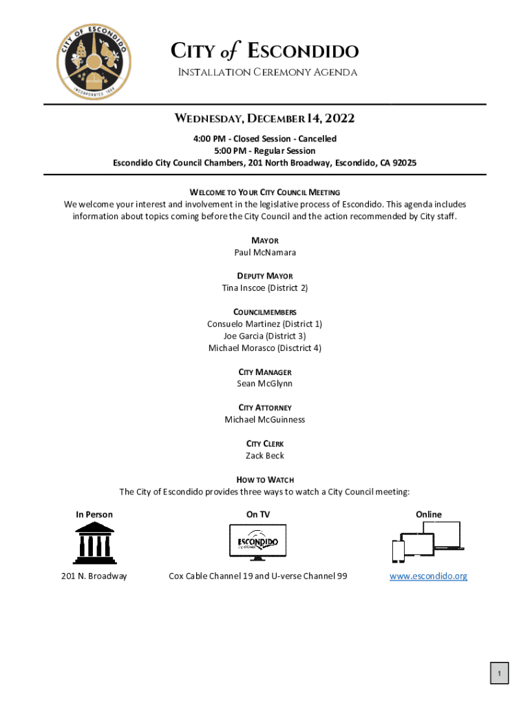 CITY of ESCONDIDO Installation Ceremony AgendaWEDNESDAY, DECEMBER 14, 2022 4:00 PM Closed Session Cancelled 5:00 PM Regular Session Escondido City Council Chambers, 201 North Broadway, Escondido,