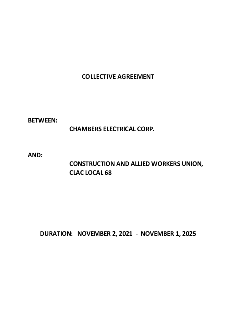 COLLECTIVE AGREEMENTBETWEEN: CHAMBERS ELECTRICAL CORP.AND: CONSTRUCTION AND ALLIED WORKERS UNION, CLAN LOCAL 68DURATION: NOVEMBER 2, 2021, NOVEMBER 1, 2025TABLE OF CONTENTS ARTICLE 1 PURPOSE .............................................................................