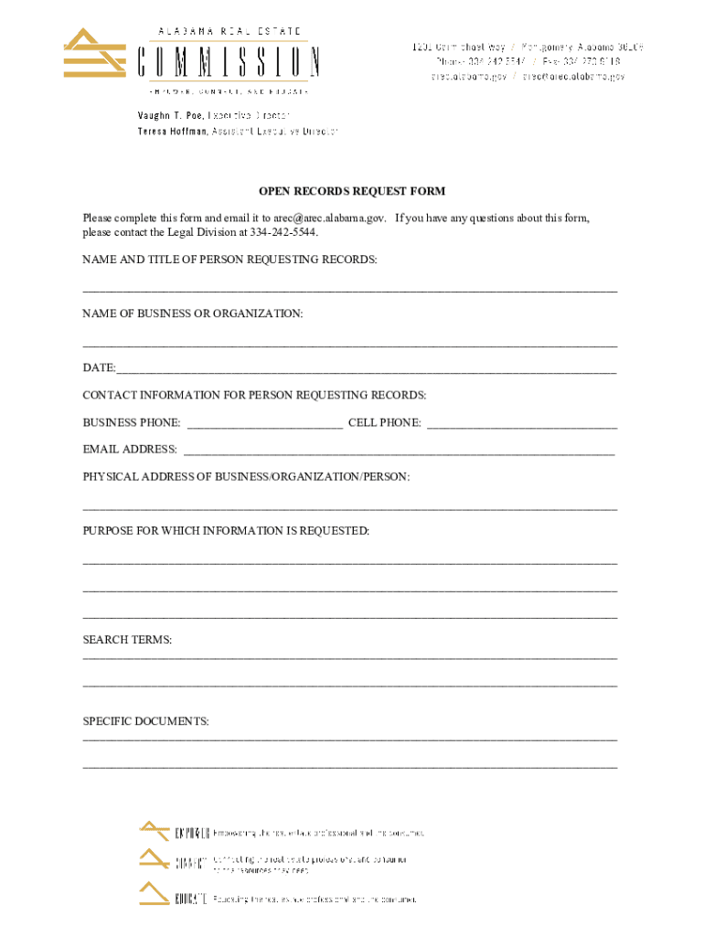 OPEN RECORDS REQUEST FORM Please complete this form and email it to arec@arec.alabama.gov. If you have any questions about this form, please contact the Legal Division at 3342425544. NAME AND TITLE