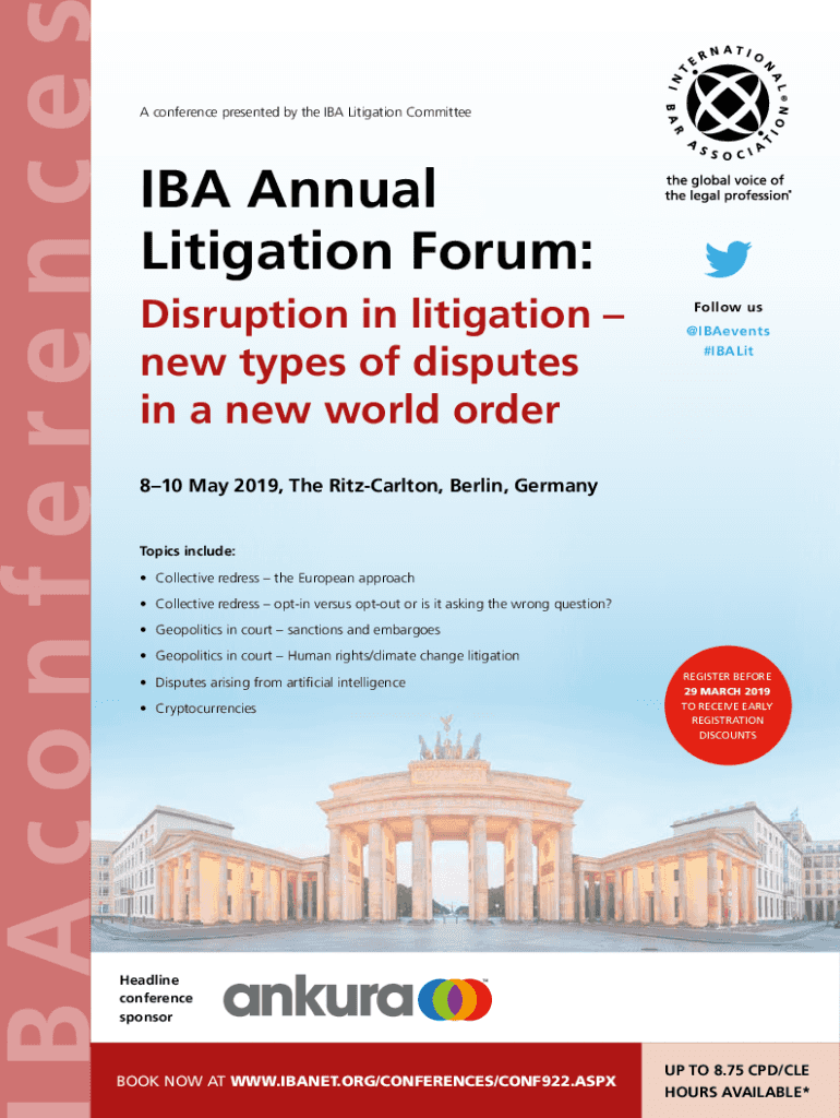 A conference presented by the IBA Litigation Committee IBA Annual Litigation Forum: Disruption in litigation new types of disputes in a new world orderFollow us @IBAevents #IBALit810 May 2019, The