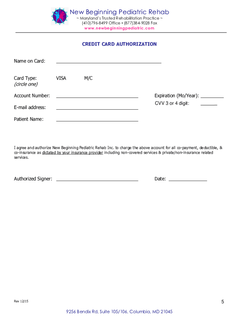 New Beginning Pediatric Rehab Maryland's Trusted Rehabilitation Practice (410)7968499 Office (877)3849028 Fax www.newbeginningpediatric.comPATIENT/PARENT INFORMATION Patient Full Name:Patients Date