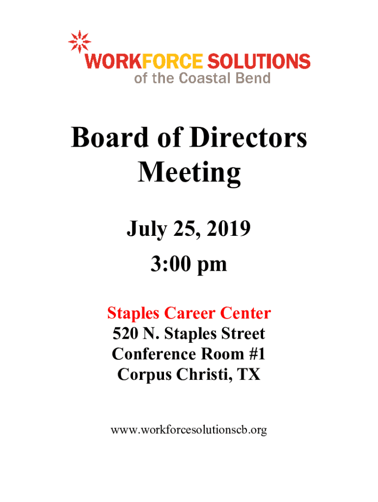 Board of Directors Meeting July 25, 2019 3:00 pm Staples Career Center 520 N. Staples Street Conference Room #1 Corpus Christi, TX www.workforcesolutionscb.orgStrategic Goals Establish and Strengthen