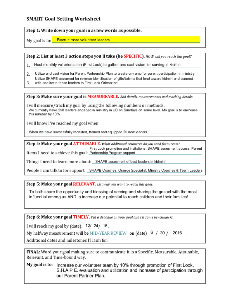 SMART Goalkeeping Worksheets 1: Write down your goal in as few words as possible. Recruit more volunteer leaders My goal is to: ___Step 2: List at least 3 action steps you\'ll take (be SPECIFIC).