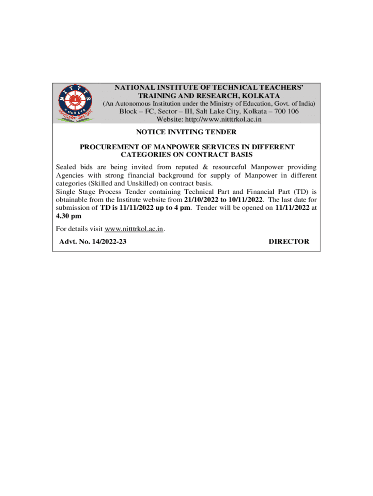 NATIONAL INSTITUTE OF TECHNICAL TEACHERS TRAINING AND RESEARCH, KOLKATA (An Autonomous Institution under the Ministry of Education, Govt. of India)Block FC, Sector III, Salt Lake City, Kolkata 700