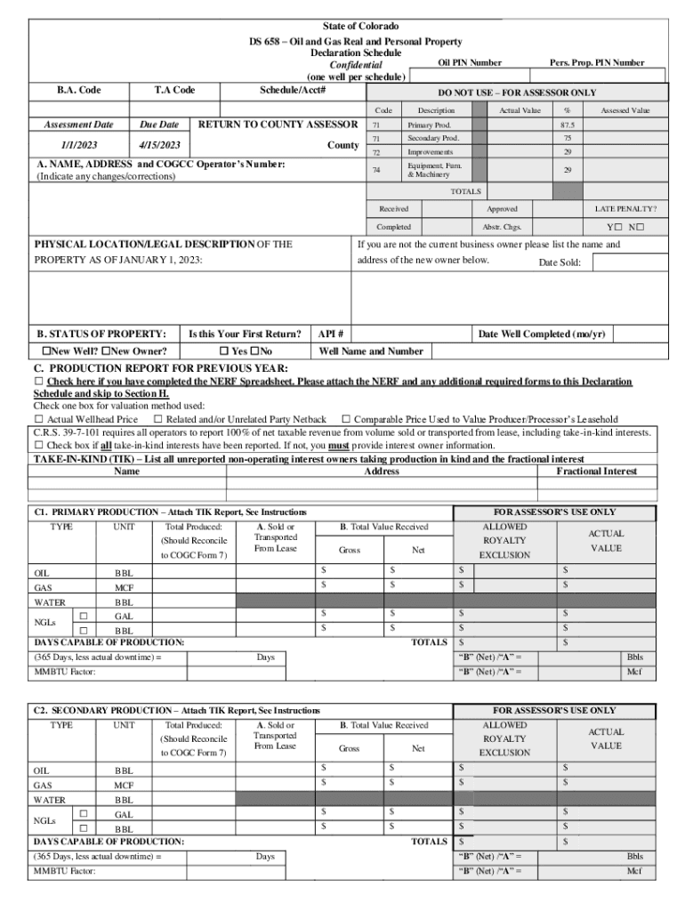 15DPTAS DS 658 xx/23DS 658 Oil & Gas Real and Personal Property Declaration Schedule and InstructionsState of ColoradoTHIS SCHEDULE MUST BE FILED EVERY YEAR REGARDLESS IF ANY ADDITIONS OR DELETIONS