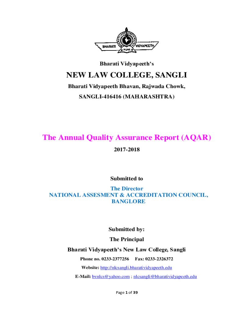 Bharat VidyapeethsNEW LAW COLLEGE, SANG LI Bharat Vidyapeeth Haven, Ramada Chow, SANGLI416416 (MAHARASHTRA)The Annual Quality Assurance Report (AGAR) 20172018Submitted to The Director NATIONAL ASSESSMENT