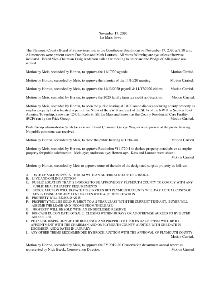 Le Mars, Loathe Plymouth County Board of Supervisors met in the Courthouse Boardroom on November 17, 2020, at 9:30 a.m.
