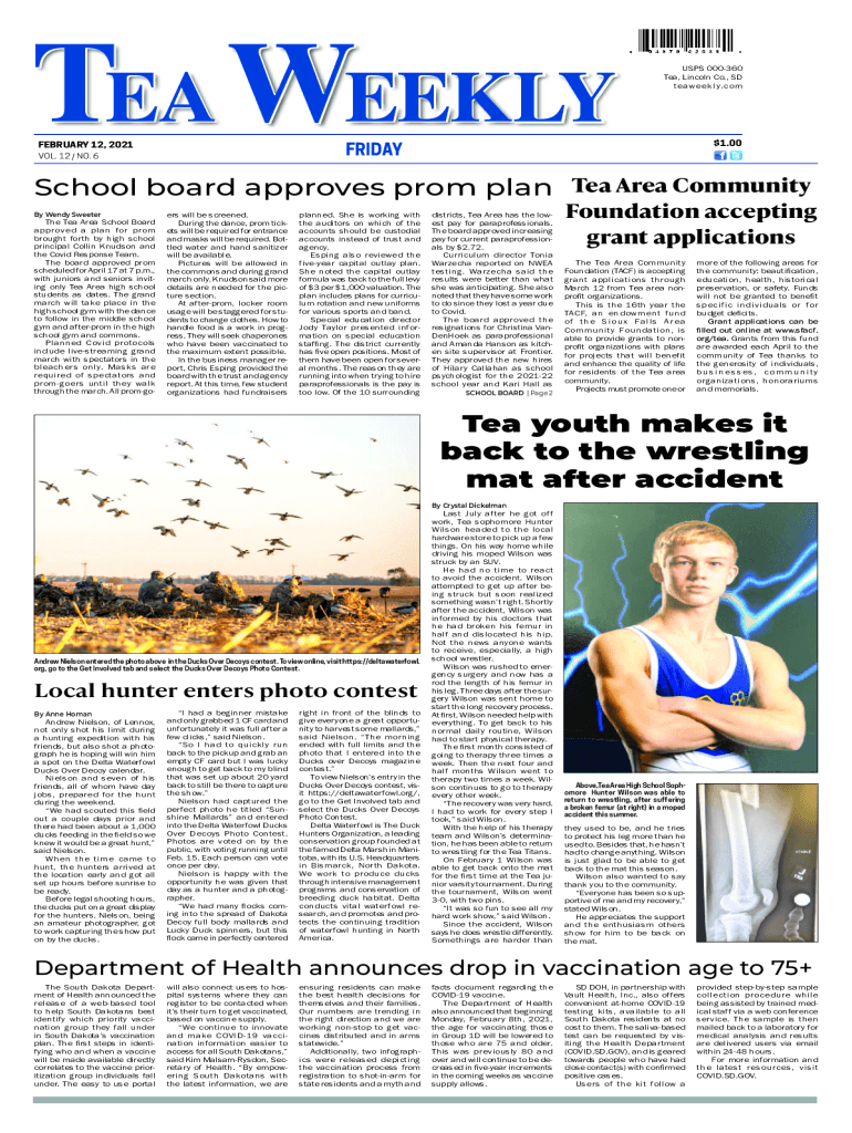 TEA WEEKLY FEBRUARY 12, 2021USPS 000360 Tea, Lincoln Co., SD tea weekly.com$1.00FRIDAYVOL. 12 / NO. 6School board approves prom plan Tea Area Community By Wendy Sweeter Tea Area School Board approved