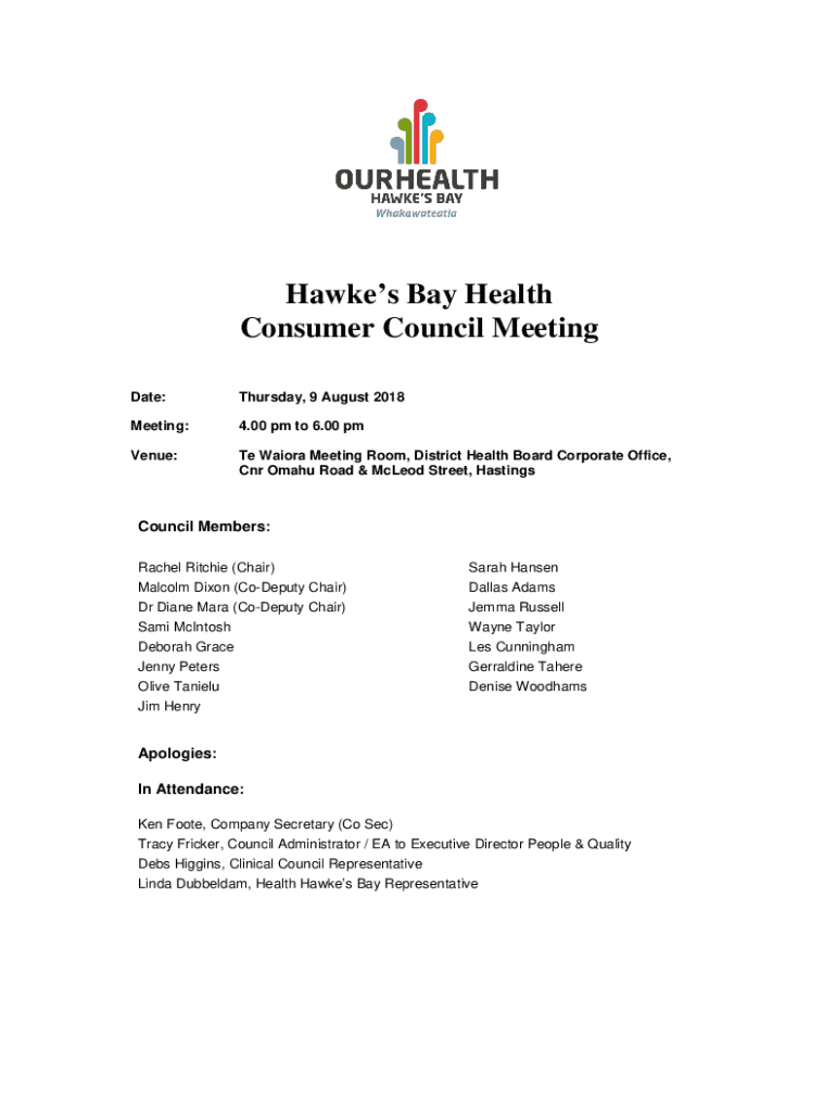 Date:Thursday, 9 August 2018Meeting:4.00 pm to 6.00 revenue:Te Zamora Meeting Room, District Health Board Corporate Office,