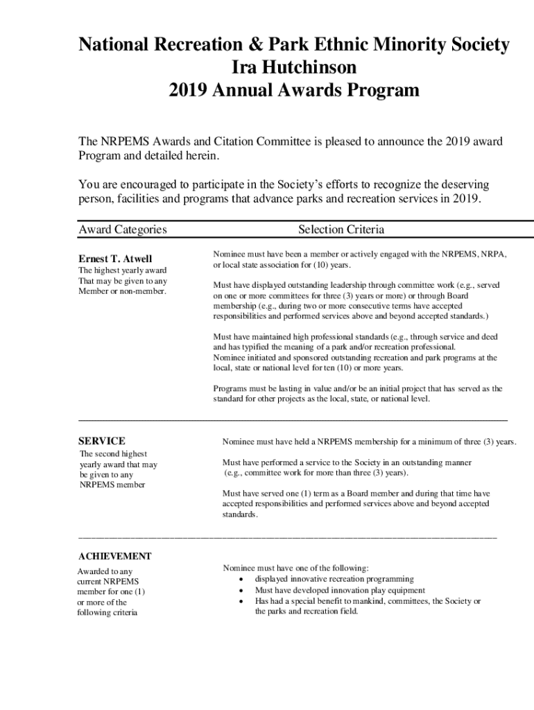 National Recreation & Park Ethnic Minority Society Ira Hutchinson 2019 Annual Awards Program The NAPES Awards and Citation Committee is pleased to announce the 2019 award Program and detailed herein.