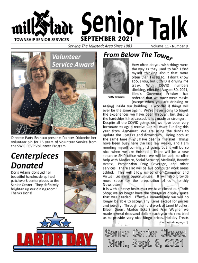 TOWNSHIP SENIOR SERVICESSEPTEMBER 2021Serving The Militant Area Since 1983Volunteer Service AwardDirector Patty Evans co presents Frances Nickname her volunteer pin for 15 years of Volunteer Service