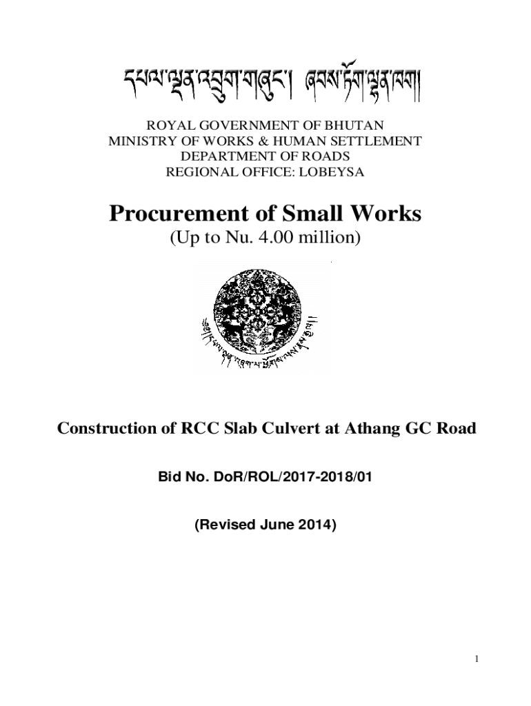 ROYAL GOVERNMENT OF BHUTAN MINISTRY OF WORKS & HUMAN SETTLEMENT DEPARTMENT OF ROADS REGIONAL OFFICE: LOBEYSAProcurement of Small Works (Up to Nu. 4.00 million)Construction of RCC Slab Culvert at hang